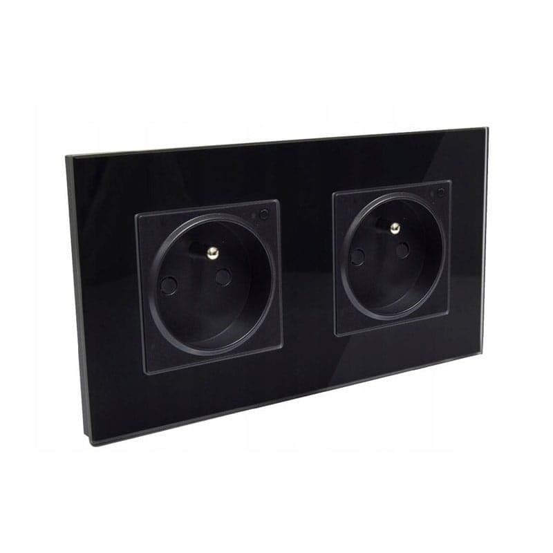 Gniazdko elektryczne ze szklanym panelem w kolorze czarnym, z uziemieniem oraz zabezpieczeniem prądowym przed dziećmi. Zastosowane szkło jest wysokiej jakości, hartowane, odporne na zarysowania i wysoką temperaturę. Pasuje do puszki o średnicy 140 mm, ale można je zamontować również w dwóch puszkach 60 mm (brak puszek w zestawie). Bolec uziemiający w kolorze miedzianym.