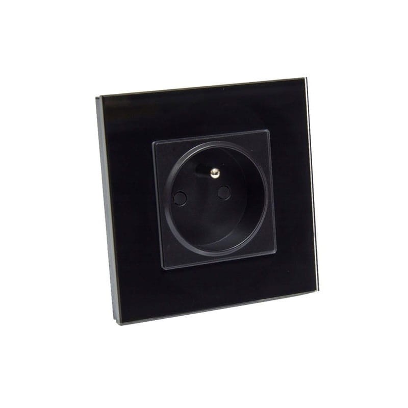 Gniazdko elektryczne ze szklanym panelem w kolorze czarnym, z uziemieniem oraz zabezpieczeniem prądowym przed dziećmi. Zastosowane szkło jest wysokiej jakości, hartowane, odporne na zarysowania i wysoką temperaturę. Pasuje do puszki o średnicy 60 mm (brak puszki w zestawie). Bolec uziemiający w kolorze miedzianym.