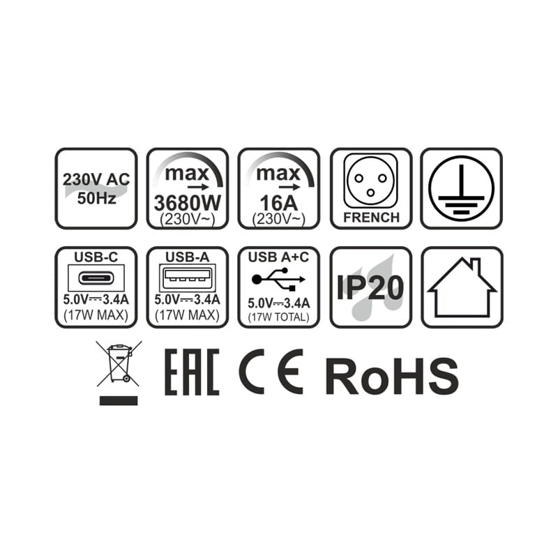 Złącza: Gniazdo 230V AC oraz porty USB typu A+C z funkcją ładowania (3,4A), które umożliwiają jednoczesne korzystanie z urządzeń elektrycznych i ładowanie smartfonów, tabletów oraz innych sprzętów.