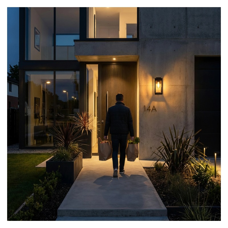 Nowoczesna lampa elewacyjna QUADRA marki Lumiled to funkcjonalne i estetyczne oświetlenie zewnętrzne, które automatycznie reaguje na otoczenie. Idealna do montażu przy wejściu, na tarasie, balkonie czy w strefie garażowej.