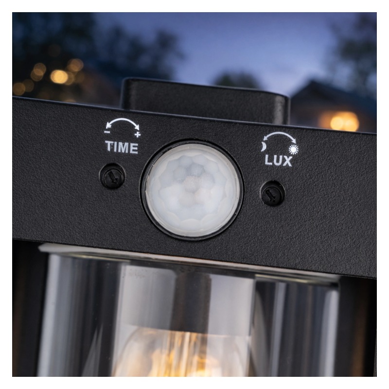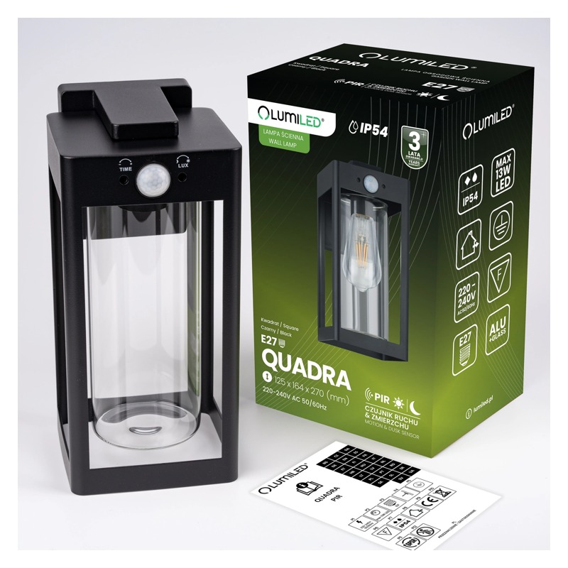 Kinkiet ogrodowy QUADRA E27 z czujnikiem ruchu i zmierzchu – IP54, 27 cm, czarny