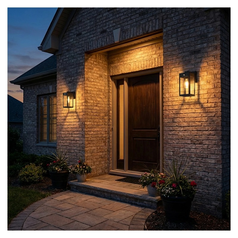 Prostokątna forma, matowa czarna obudowa i przezroczysty klosz tworzą minimalistyczny, elegancki efekt, który podkreśla architekturę budynku.