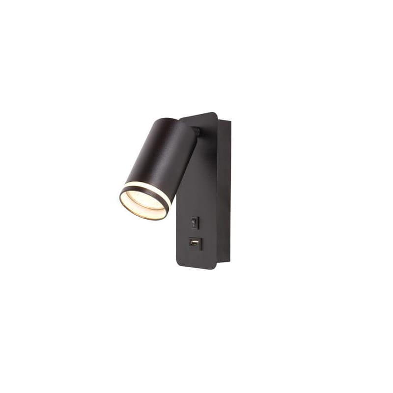 Kinkiet, lampa pojedyncza, regulowana, w formie metalowego prostokąta mocowana do ściany, z pojedynczym reflektorkiem, który można regulować pod dowolnym kątem. Oprawa ma kolor biały matowy. Lampa zasilania jest z sieci energetycznej 220-240V. Lampa posiada wyłącznik oraz gniazdo USB 5V 2A, za pomocą którego możemy naładować nasze urządzenia.