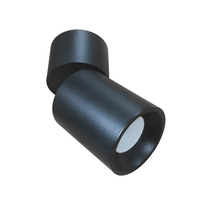 Kinkiet, lampa sufitowa pojedyncza, regulowana, okrągła, mocowana do ściany, z jednym walcowatym reflektorem, który można regulować pod dowolnym kątem. Oprawa ma kolor czarny. Lampa zasilania jest z sieci energetycznej 220-240V. Do lampy można stosować żarówki z mocowaniem GU10 z maksymalną mocą 10W każda, do zestawu nie są dołączone lampy, można je dokupić w naszym sklepie jako osobny artykuł.