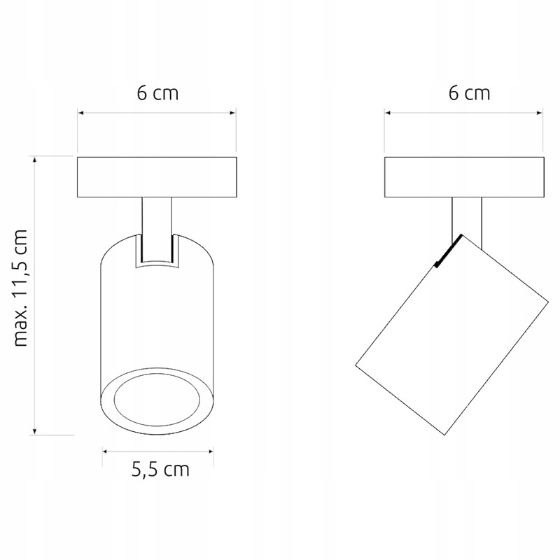 Korpus lampy wykonany jest z metalu, co zapewnia trwałość, odporność na uszkodzenia oraz estetyczny wygląd przez długi czas użytkowania. Tuba o średnicy 5,5cm i wysokości 9cm została osadzona na kompaktowej podstawie montażowej o wymiarach 6x6cm i wysokości 2,5cm, dzięki czemu oprawa prezentuje się dyskretnie i nie dominuje przestrzeni. Klasa szczelności IP20 sprawia, że lampa przeznaczona jest do użytku wewnętrznego w suchych pomieszczeniach.