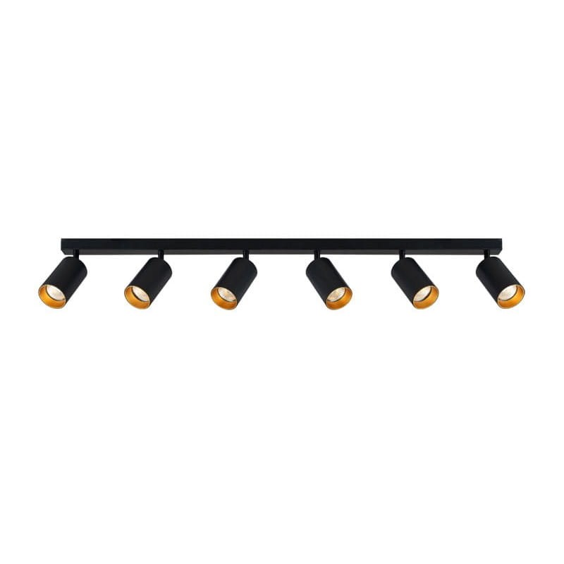 Kinkiet, lampa sufitowa sześciopunktowa, regulowana, w formie metalowej listwy mocowana do sufitu, z sześcioma walcowatymi reflektorami, które można regulować pod dowolnym kątem. Oprawa ma kolor czarny matowy, natomiast środek wykończony jest w kolorze złotym. Lampa zasilania jest z sieci energetycznej 220-240V. Do lampy można stosować żarówki z mocowaniem GU10 z maksymalną mocą 35W każda, do zestawu nie są dołączone żarówki, można je dokupić w naszym sklepie jako osobny artykuł.