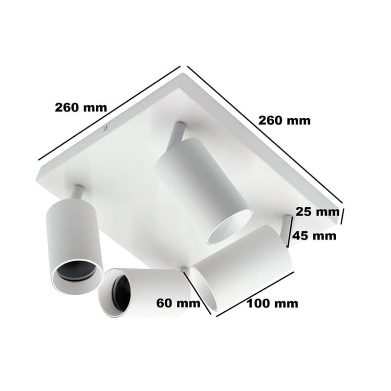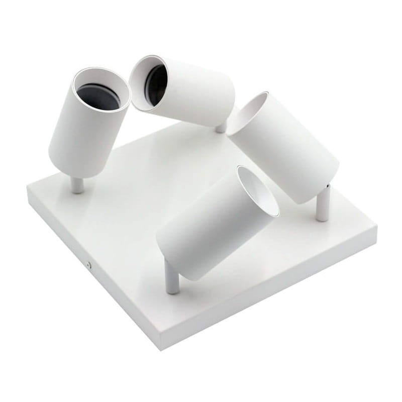 Kinkiet, lampa sufitowa poczwórna, regulowana, w formie metalowego kwadratu mocowana do ściany, z czterema walcowatymi reflektorami, które można regulować pod dowolnym kątem. Oprawa ma kolor biały matowy. Lampa zasilania jest z sieci energetycznej 220-240V. Do lampy można stosować żarówki z mocowaniem GU10 z maksymalną mocą 40W każda, do zestawu nie są dołączone żarówki, można je dokupić w naszym sklepie jako osobny artykuł.