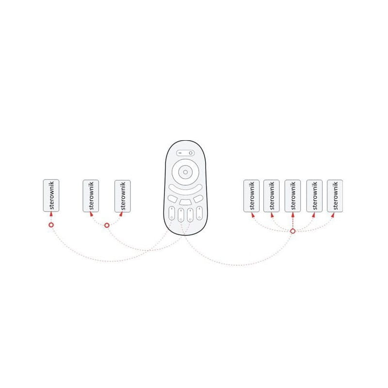 W komplecie znajduje się pilot oraz cztery odbiorniki, w ten sposób możemy za pomocą jednego pilota sterować czterema strefami oświetlenia.