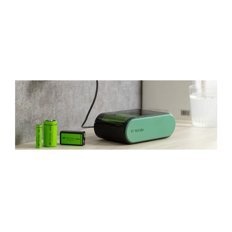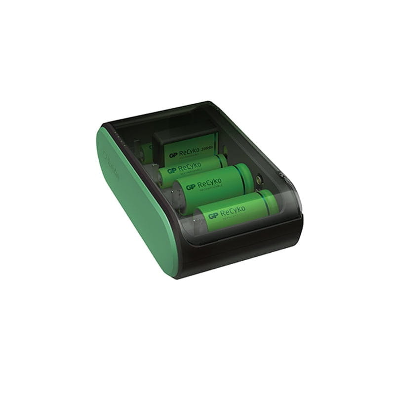 Ładowarka uniwersalna GP ReCyko, z 4-kanałowym systemem ładowania i 2 osobnymi gniazdami do ładowania akumulatorów 9V, umożliwia jednoczesne ładowanie do 6 akumulatorów o różnych rozmiarach.
