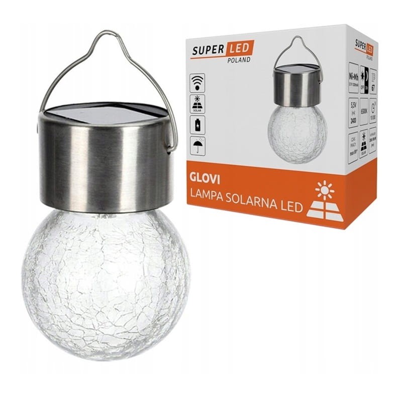 Lampa ogrodowa solarna kula wisząca szklana biała zimna