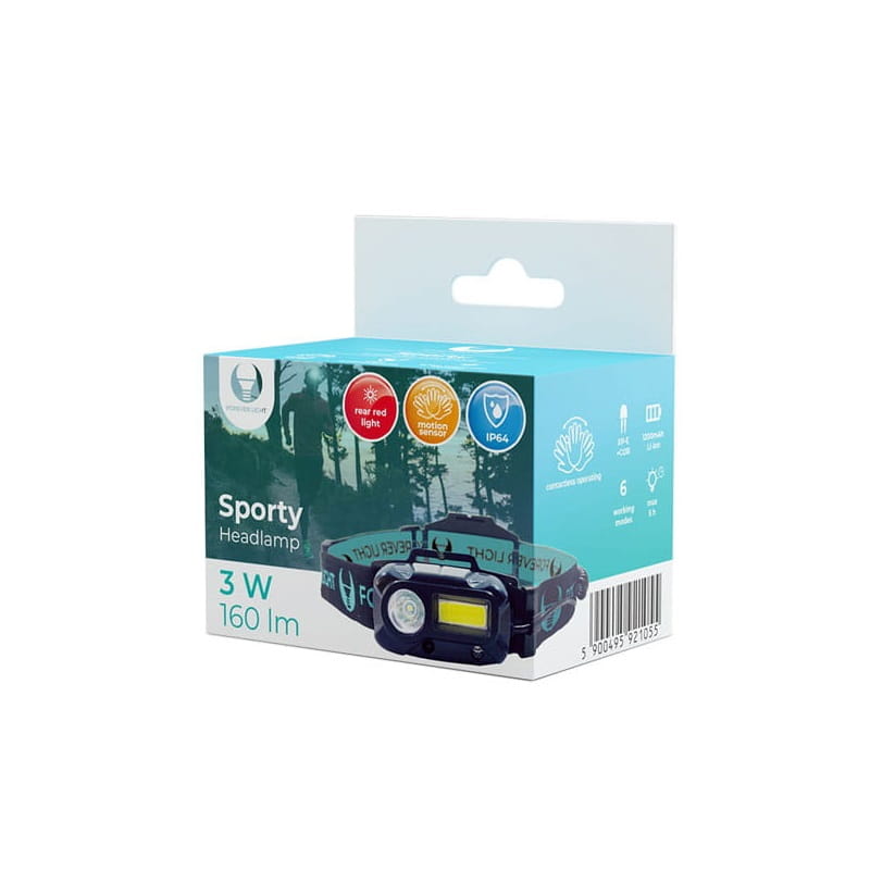 Latarka czołowa Forever Light Sporty z tylnym czerwonym światłem to doskonały wybór na wieczorne bieganie lub przejażdżkę rowerową. Świetnie sprawdzi się również na campingu lub przy naprawie samochodu. Latarka ma wbudowane dwa rodzaje diod: XP-E o mocy 160lm i COB o mocy 80lm oraz pracujące z nimi tylne czerwone światło. Dioda XP-E emituje mocne, intensywne, skupione światło z kolei dioda COB oferuje szerokie, rozproszone. Dodatkową opcją jest możliwa bezdotykowa obsługa latarki za pomocą czujnika ruchu. Włączniki odpowiadają umieszczonej poniżej diodzie. Tryby pracy: naciśnij przycisk po lewej aby włączyć diodę XP-E: 100% jasności - 75% - Flash - SOS - OFF. Naciśnij przycisk po prawej aby włączyć diodę COB: 100% jasności - 75% - OFF. Czerwona dioda umieszczona z tyłu działa w tym samym trybie co przednia. Aby włączyć sensor ruchu przytrzymaj wybrany przycisk przez 3 sekundy, który podświetli się na czerwono a następnie przesuń dłonią maksymalnie do 10 cm od latarki aby ją włączyć. Ten sam ruch powoduje wyłączenie. Aby wyłączyć sensor naciśnij przycisk jeszcze raz. Złącze ładowania akumulatora znajduje się wewnątrz tylnej obudowy.
