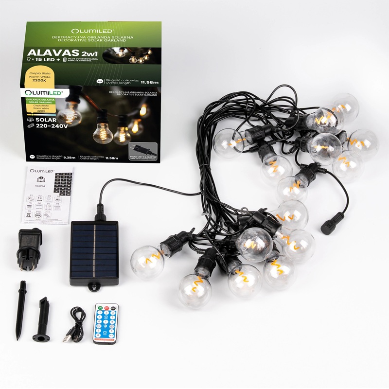 Girlanda solarna LED ALAVAS 11,58 m 2200K – 15 żarówek + pilot, ciepłe światło retro