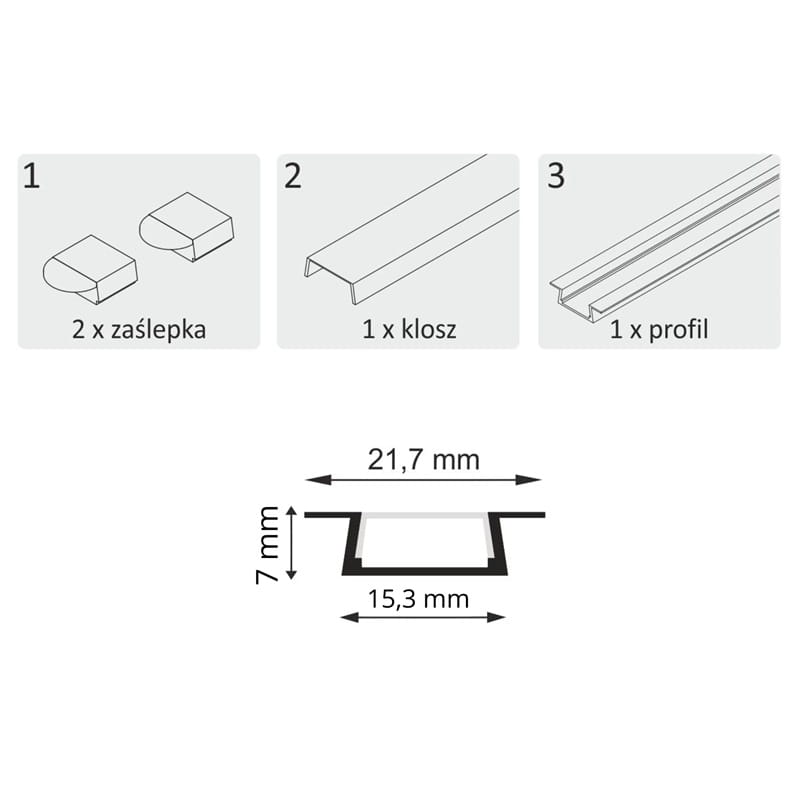 PROFIL aluminiowy wpuszczany czarny do TAŚMY LED 2 metry + klosz + zaślepki