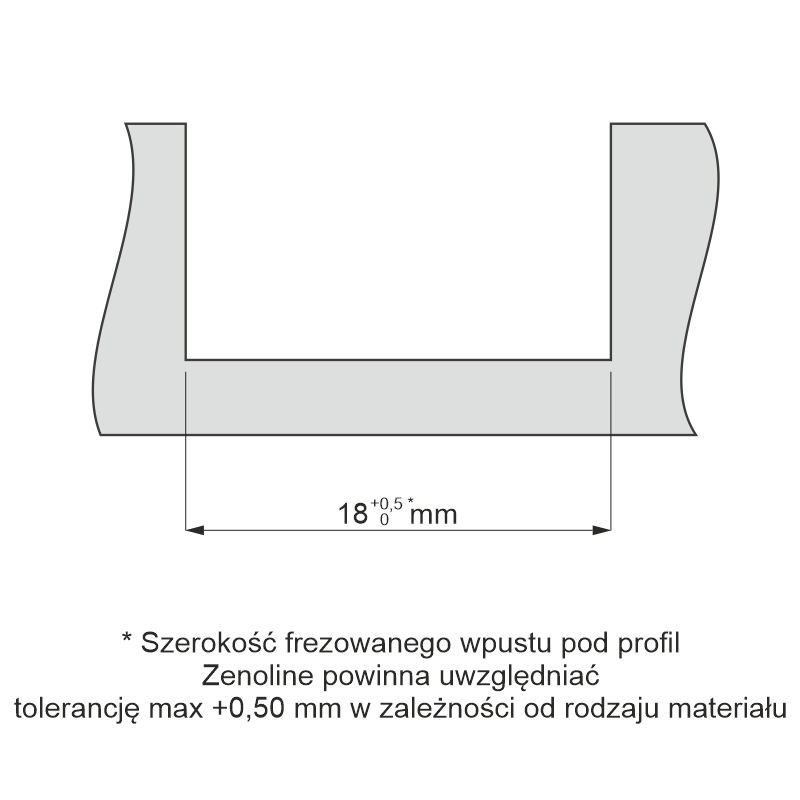 ZENOLINE przeznaczony jest do montażu we wpuszczeniu, czyli w odpowiednio wykonanym frezie w płycie meblowej. Zalecana głębokość frezowania wynosi 10–11 mm, przy tolerancji wymiaru otworu montażowego ±0,50 mm. Po zamontowaniu profil idealnie licuje się z powierzchnią, dzięki czemu pozostaje niemal niewidoczny, a widoczne jest wyłącznie światło.