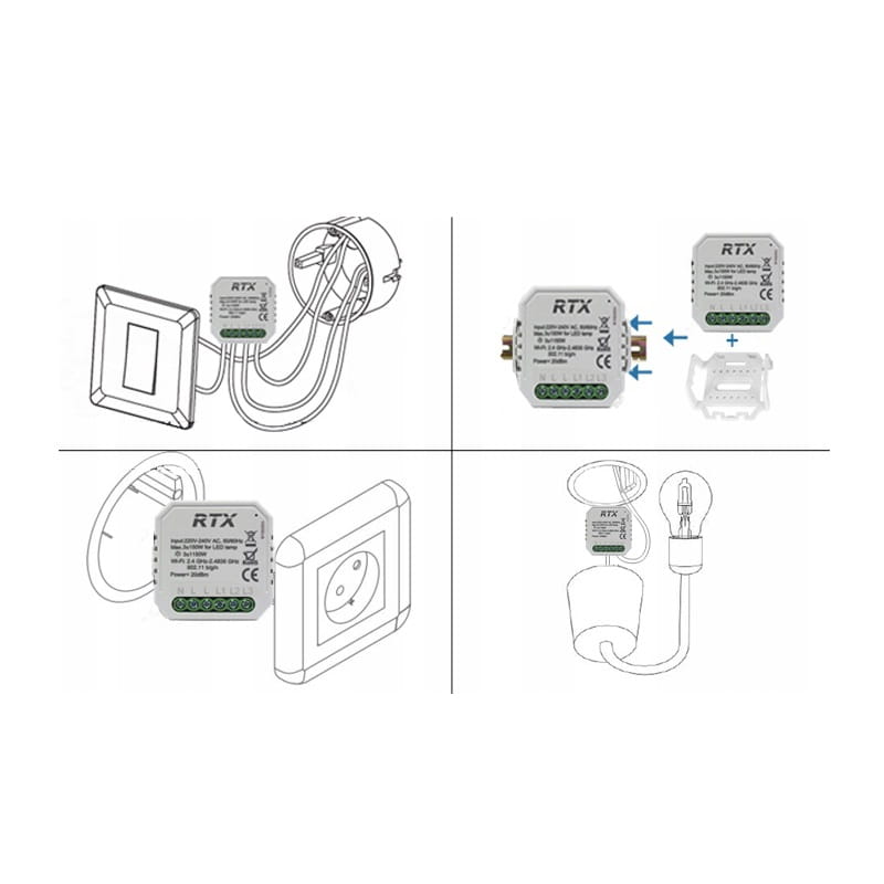 Małe wymiary pozwalają na montaż urządzenia w puszce ściennej lub oprawie oświetleniowej, a także na szynie DIN w skrzynce bezpiecznikowej za pomocą uchwytu zawartego w zestawie.