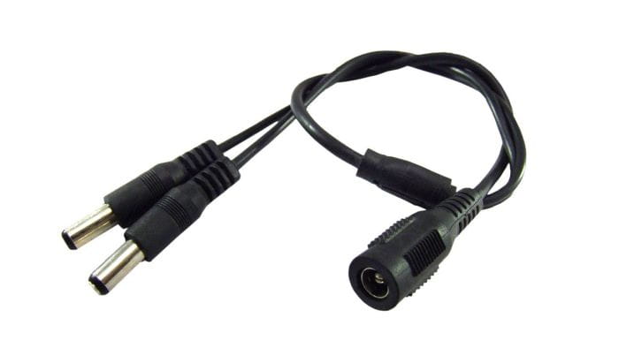 Rozgałęźnik napięcia DC. Rozgałęźnik posiada jedno gniazdo zasilające o średnicy 2,1 x 5,5 mm z rozdzieleniem na 2 wtyczki zasilające DC o średnicy 2,1 x 5,5 mm. Złącze pozwala na podział napięcia z jednego zasilacza na kilka urządzeń odbiorczych. .