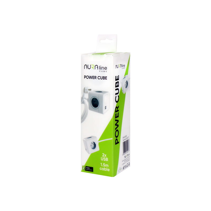 Rozgałęźnik Auraline Power Cube 4 gniazda 230V 16A + 2xUSB 2,1A, z przewodem 1,5m, uziemienie biały