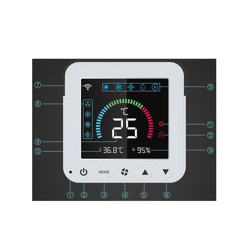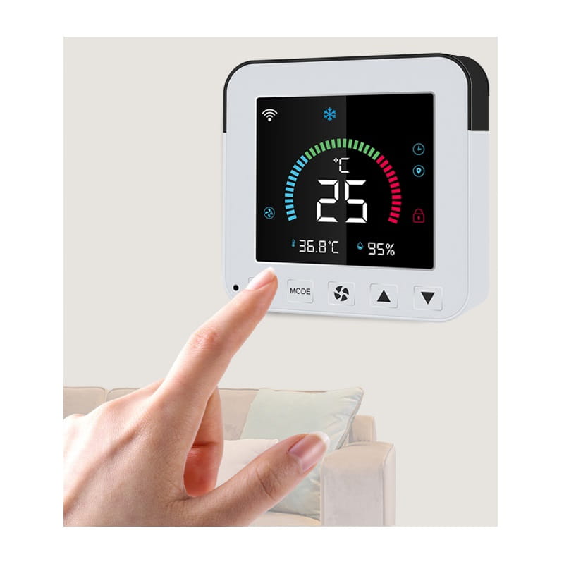 Wizualizacja i Historia: Kolorowy wyświetlacz LED pokazuje bieżące nastawy i odczyty temperatury oraz wilgotności. Sprawdź historię danych w aplikacji.