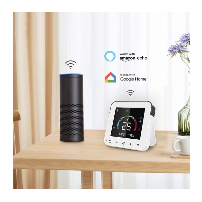 Sterowanie Dotykowe i Głosowe: Panel dotykowy z kolorowym wyświetlaczem LED oraz obsługa głosowa przez Google Home i Alexa.