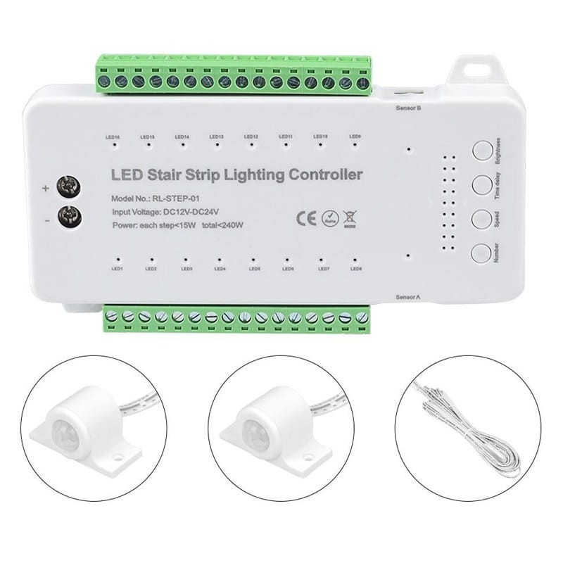 Sterownik schodowy LED PIR regulowany 16 schodów 240W 12-24V - biały + 2 czujki PIR TREP-01