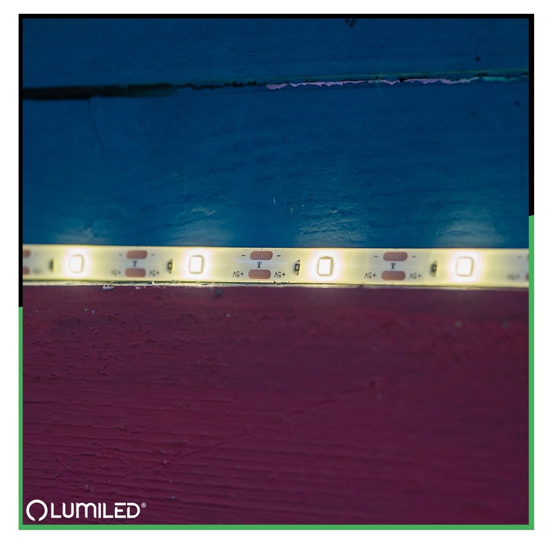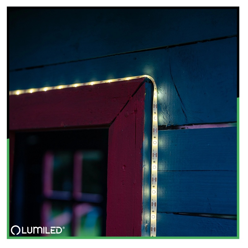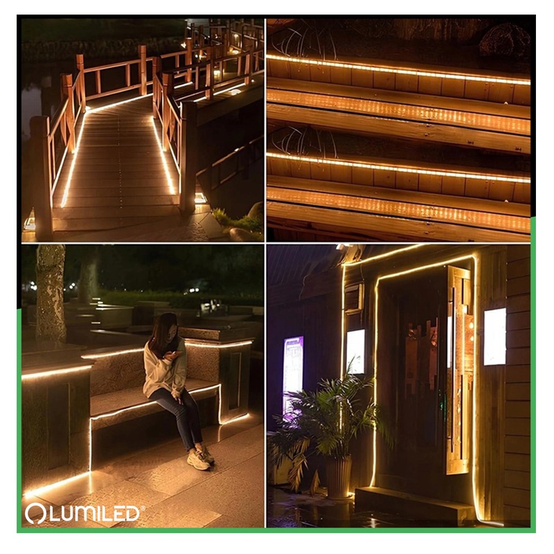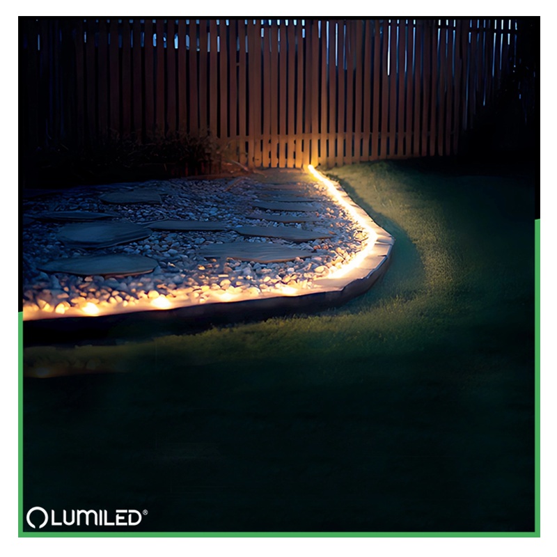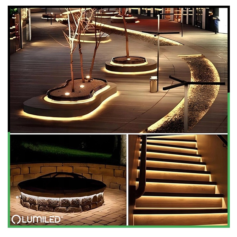Taśma świeci ciepłą bielą, idealną do tworzenia nastrojowej atmosfery w przestrzeniach wypoczynkowych. Światło doskonale komponuje się z roślinnością, drewnianą architekturą ogrodową oraz nowoczesnymi aranżacjami tarasów.