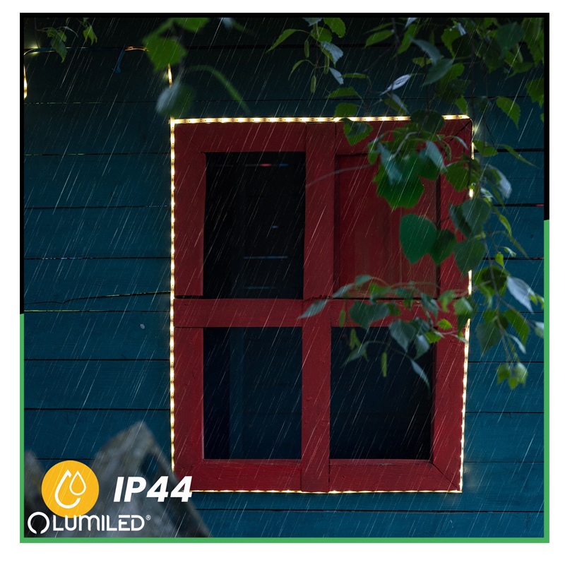 Taśma została wykonana z trwałych materiałów poliwęglanu (PC) oraz tworzywa ABS, co zapewnia odporność na deszcz, wilgoć i pył. Stopień ochrony IP44 sprawia, że produkt jest przystosowany do użytku na zewnątrz przez cały sezon.