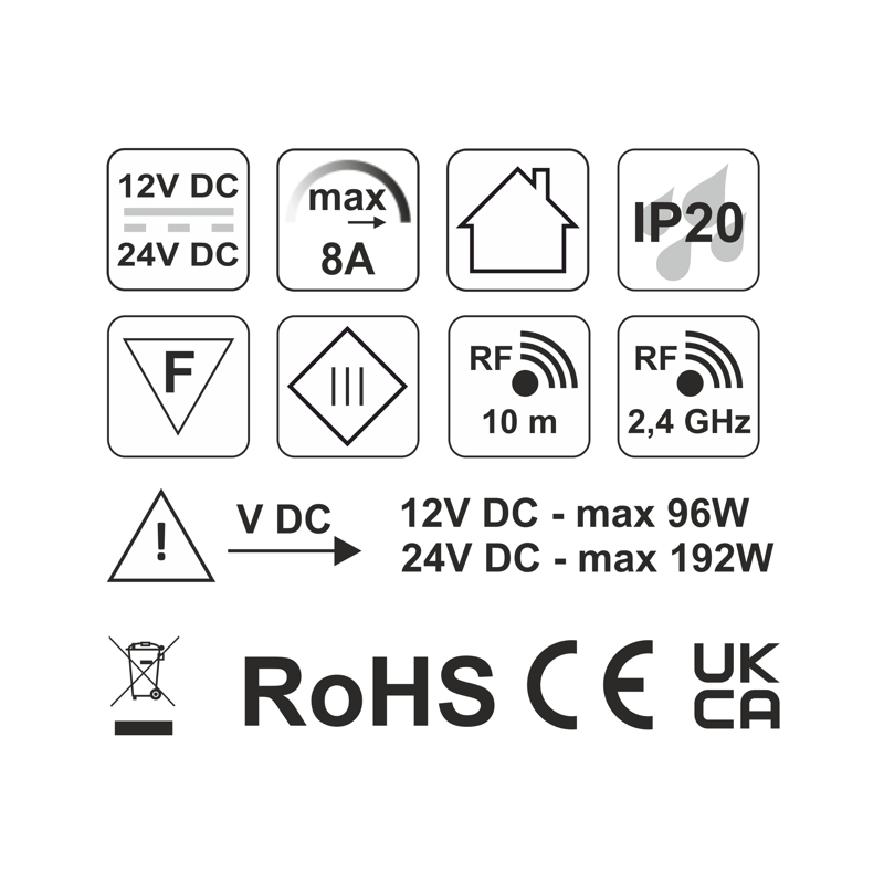 Produkt przeznaczony jest do użytku wewnętrznego (IP20). Sterowanie odbywa się radiowo w zakresie 10 m. Wymiary urządzenia wynoszą 106×46×12 mm, a obudowa wykonana jest z trwałego tworzywa sztucznego. Wyłącznik działa w standardowym zakresie napięcia 12V DC / 24V DC, obsługując moc do 96W (12V) lub 192W (24V). Nowoczesny, minimalistyczny design sprawia, że wyłącznik doskonale komponuje się z każdym wnętrzem.