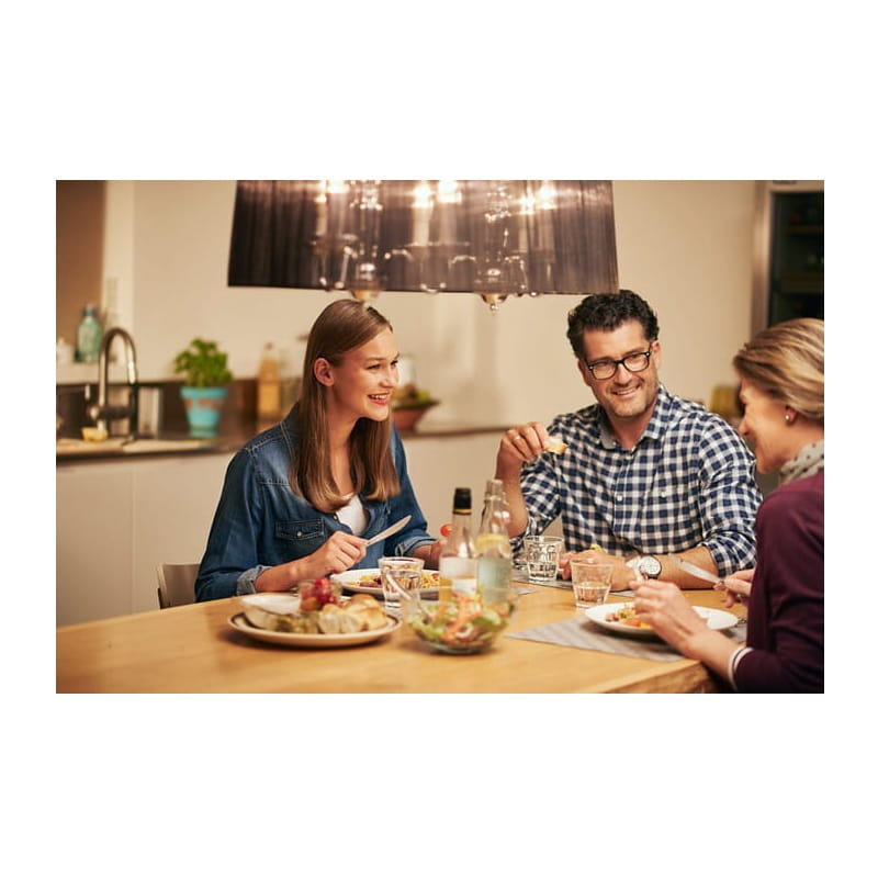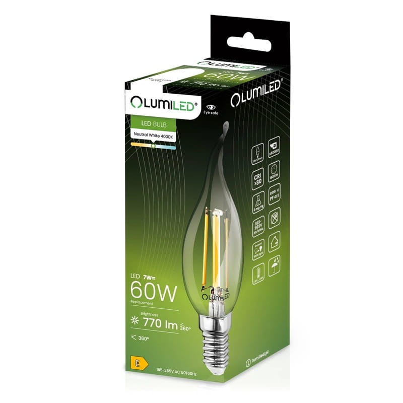 Lampa ma moc 7W i wyposażona została w diody filament, ta przełomowa konstrukcja zawiera włókna LED umiejscowione identycznie jak tradycyjne włókno żarowe, dlatego trudno ją odróżnić od wolframowego poprzednika. Emituje strumień świetlny 770 lumenów i świeci światłem białym neutralnym.
