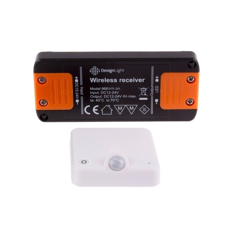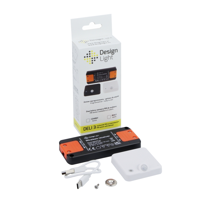W skład zestawu wchodzi bezprzewodowy sensor PIR ze ściemniaczem w kolorze białym, sterownik RF, magnes z wkrętem, przewód do ładowania USB-C oraz instrukcja montażu. Zestaw współpracuje z oświetleniem LED 12V lub 24V DC o mocy do 96W lub 192W, dzięki czemu sprawdzi się zarówno w mniejszych, jak i bardziej rozbudowanych instalacjach.